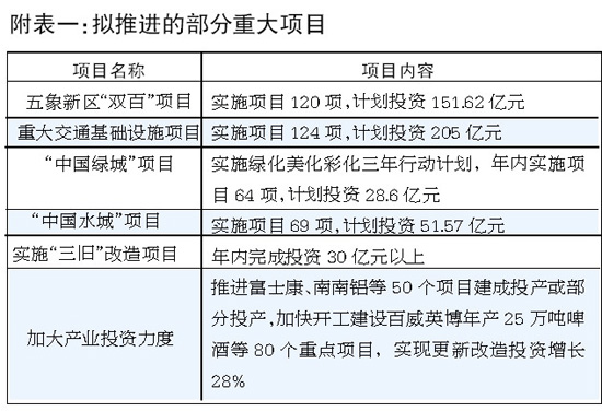 今年,南寧市將以頭部期城建計(jì)劃(建設(shè)項(xiàng)目407個(gè),投資249億元;前期項(xiàng)目179個(gè))為重點(diǎn),加快以道路、橋梁為重點(diǎn)的城市重大交通基礎(chǔ)設(shè)施建設(shè)項(xiàng)目(實(shí)施項(xiàng)目124項(xiàng),計(jì)劃投資205億元);圍繞做好“綠水新舊通”五篇文章和重大產(chǎn)業(yè)發(fā)展,全力推進(jìn)重點(diǎn)領(lǐng)域重大項(xiàng)目建設(shè)(具體項(xiàng)目詳見(jiàn)附表一)。