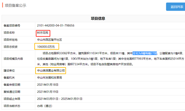 根據(jù)備案信息,“時方花苑”總投資額10.6億元,項(xiàng)目占地面積33082㎡,建筑面積110341㎡,不包含別墅類房地產(chǎn)開發(fā)項(xiàng)目。