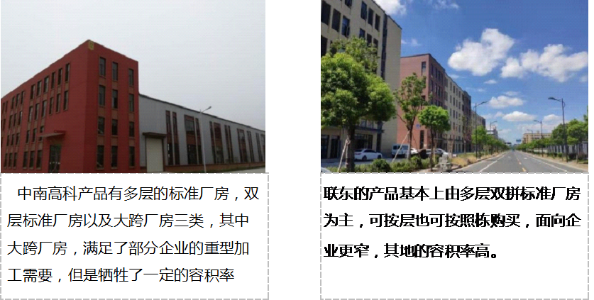 圖2:三大產(chǎn)品線中南高科產(chǎn)品內(nèi)部標(biāo)準(zhǔn)及特點(diǎn)(基于中南高科蕭山錢江云谷產(chǎn)業(yè)園與聯(lián)東集團(tuán)蕭山國(guó)際企業(yè)港產(chǎn)品比較)