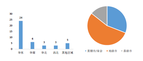 以華東區(qū)域?yàn)橹?,偏好地?jí)市在城市投資方面,中南高科在華東區(qū)域的項(xiàng)目占比為57%。在城市能級(jí)方面,項(xiàng)目投資偏好于地級(jí)市,投資占比為55%。在項(xiàng)目縱深方面,所有的縣級(jí)市項(xiàng)目均集中在華東地區(qū)。