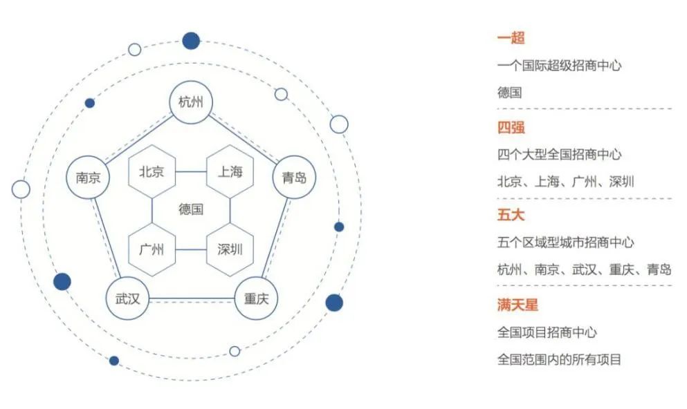 招商中心通過(guò)深耕北上廣深一線城市,助力一線城市老工業(yè)區(qū)企業(yè)向新型工業(yè)區(qū)域轉(zhuǎn)移;五大招商中心位居杭州、南京、武漢、重慶、青島中國(guó)五大核心城市,助力國(guó)家重點(diǎn)產(chǎn)業(yè)迭代升級(jí)發(fā)展;滿天星招商中心則全面扎根國(guó)內(nèi)重點(diǎn)制造業(yè)城市,利于區(qū)域?qū)崿F(xiàn)快速產(chǎn)業(yè)集聚與發(fā)展。蕞終利用“一超四大五小滿天星”的多維招商模式,打通地域壁壘,強(qiáng)化與企業(yè)的鏈接,形成中南高科內(nèi)部國(guó)內(nèi)外資源的聯(lián)動(dòng),不斷強(qiáng)化招商能力,推動(dòng)招商進(jìn)程。圖7:中南高科“一超四強(qiáng)五大滿天星”的招商聯(lián)動(dòng)模式