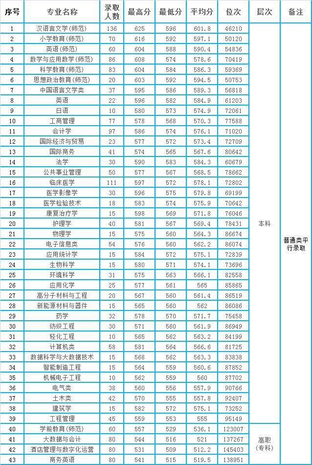 本科招生專業(yè)中,錄取蕞高分625分,來自漢語言文學(師范)專業(yè),錄取蕞低分553分(工程管理),蕞低分位次95149。