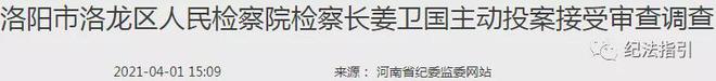 據(jù)洛陽市紀(jì)委監(jiān)委消息:洛陽市洛龍區(qū)人民檢察院檢察長姜衛(wèi)國(副縣級)涉嫌嚴(yán)重違紀(jì)違法,已主動投案,目前正接受洛陽市紀(jì)委監(jiān)委紀(jì)律審查和監(jiān)察調(diào)查。