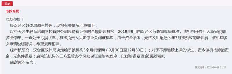 漢中市教育局回復稱,經(jīng)漢中市漢臺區(qū)教體局調查,漢中天才生教育培訓學校有限公司是持有證照的合規(guī)培訓機構,2019年9月由漢臺區(qū)行政審批局批準。該機構開辦后因新冠疫情多次停課,一直處于虧損狀態(tài),機構負責人決定停業(yè)關閉該機構;由于資金緊張,無法及時退還今年7月初預收的培訓費;該機構多次申請說明情況,希望復課銷課。