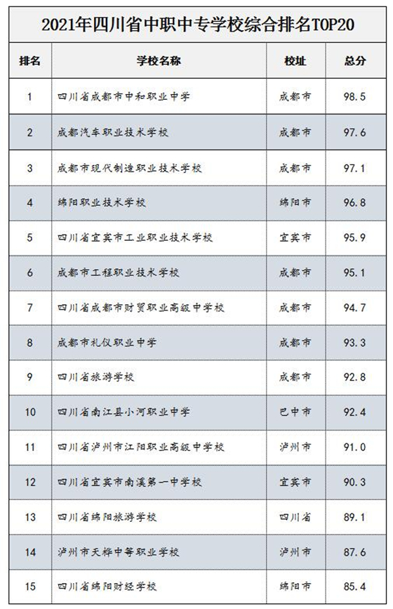 四川省成都市中和職業(yè)中學(xué)、成都汽車(chē)職業(yè)技術(shù)學(xué)校、成都市現(xiàn)代製造職業(yè)技術(shù)學(xué)校、綿陽(yáng)職業(yè)技術(shù)學(xué)校等20所中職中專(zhuān)學(xué)校入選“2021年四川省中職中專(zhuān)學(xué)校綜合排名TOP20”榜單。