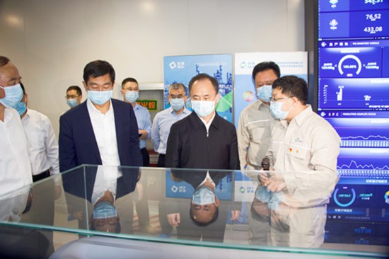 宋樂偉(前右)在江蘇中能硅業(yè)科技發(fā)展有限公司FBR顆粒硅中央數(shù)智控制中心聽取蘭天石(前左)關(guān)于協(xié)鑫集團(tuán)新能源產(chǎn)業(yè)在徐州投資發(fā)展情況的匯報(bào)。